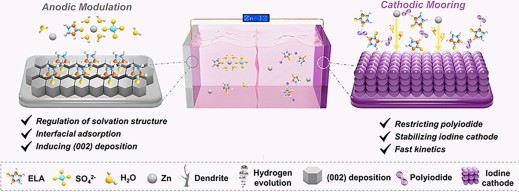 1 A dual-site functional orchestration strategy is proposed using 2-imidazolidone to simultaneously reconfigure the anodic solvation structure and suppress the cathodic polyiodide shuttle.