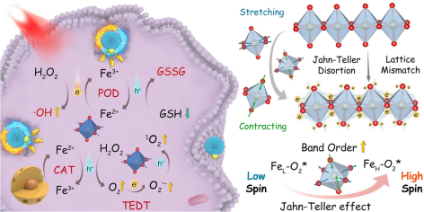 1 A Fe3O4–Ag2S p–n heterojunction is engineered to induce interfacial Jahn–Teller distortion, which modifies d-orbital splitting and enhances spin-polarized catalytic activity for synergistic tumor therapy.
